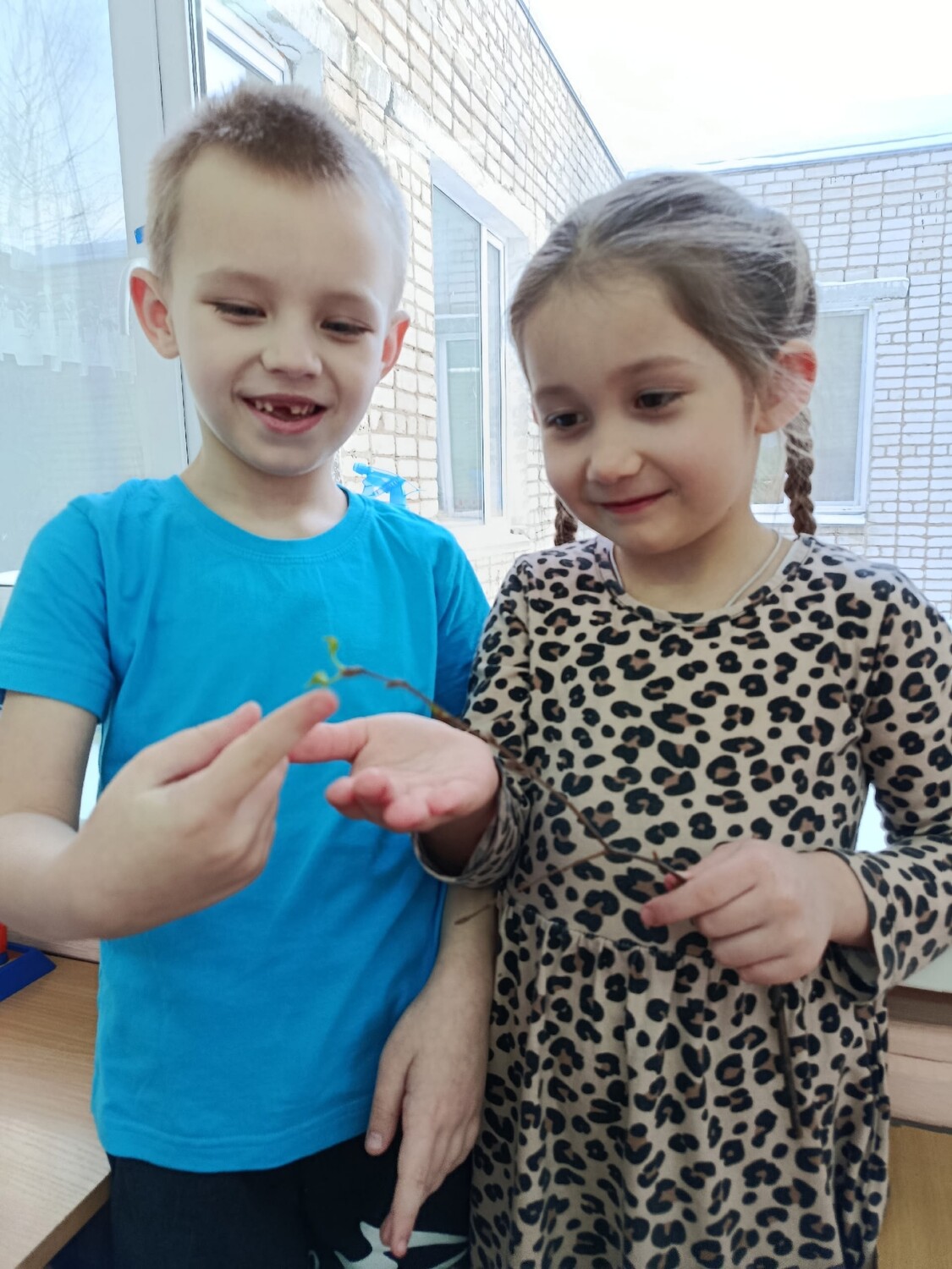 У детей группы "Ромашки" корпуса "Петушок" радостное событие. На берёзовой веточке появились первые листочки